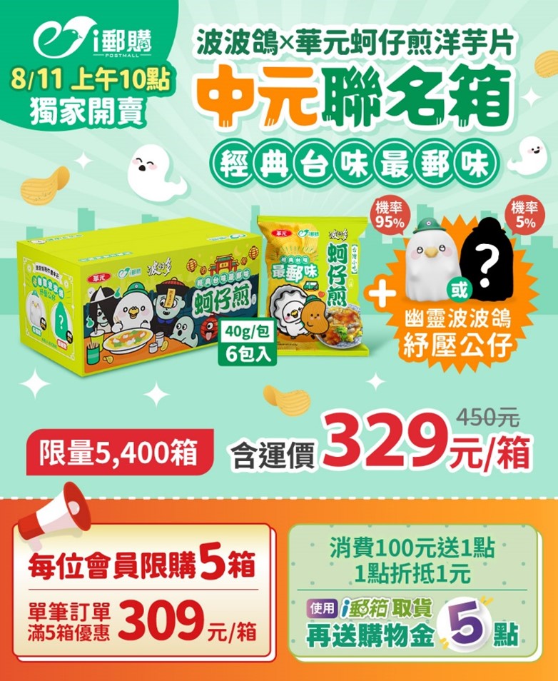 中華郵政公司114年8月11日攜手知名零食品牌華元食品,推出「波波鴿x華元蚵仔煎洋芋片」中元聯名箱,為傳統節慶注入趣味與創意,打造兼具美味、療癒與收藏價值的話題新商品。