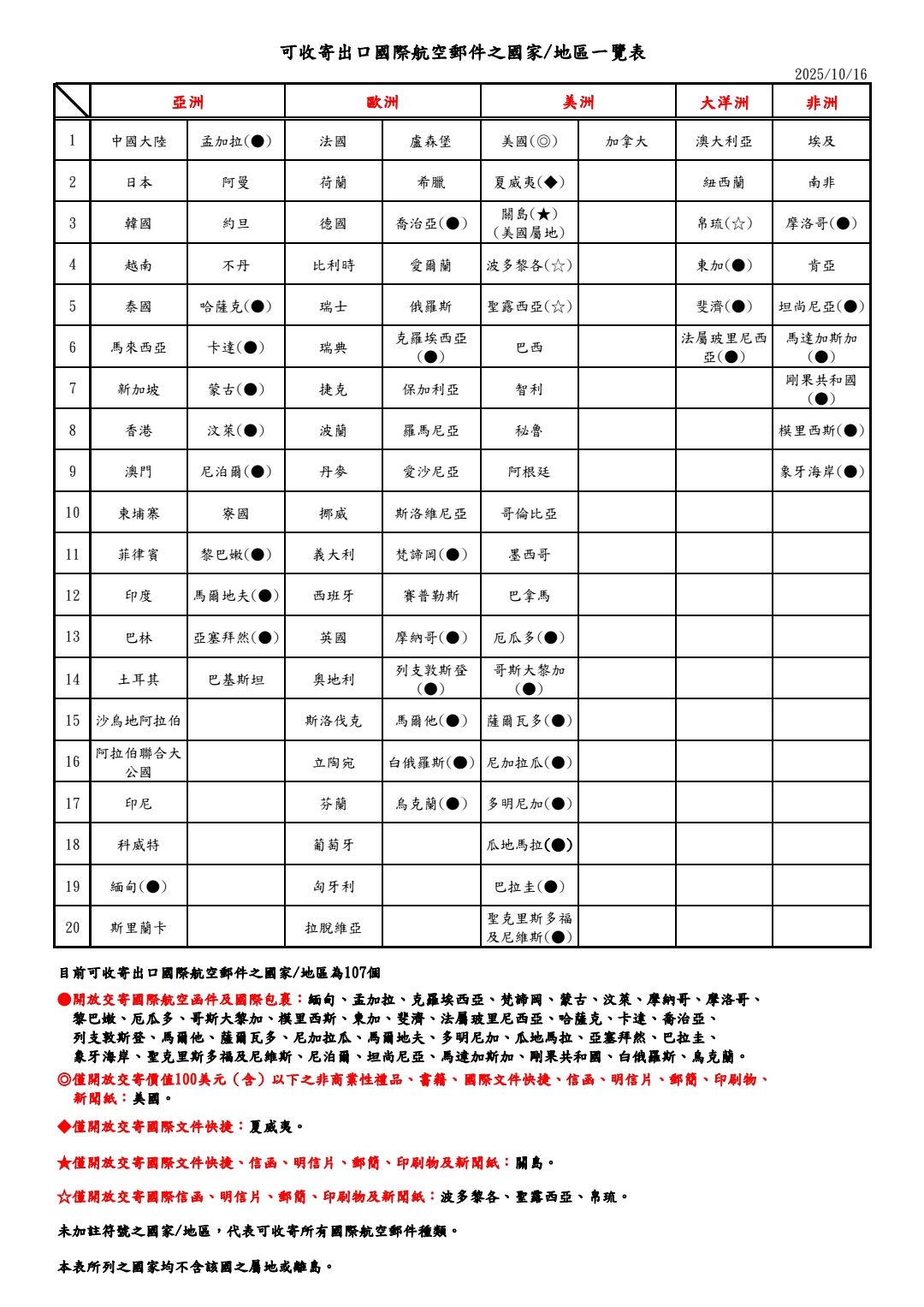一、截至目前為止「可收寄出口國際航空郵件之國家/地區」為107個。