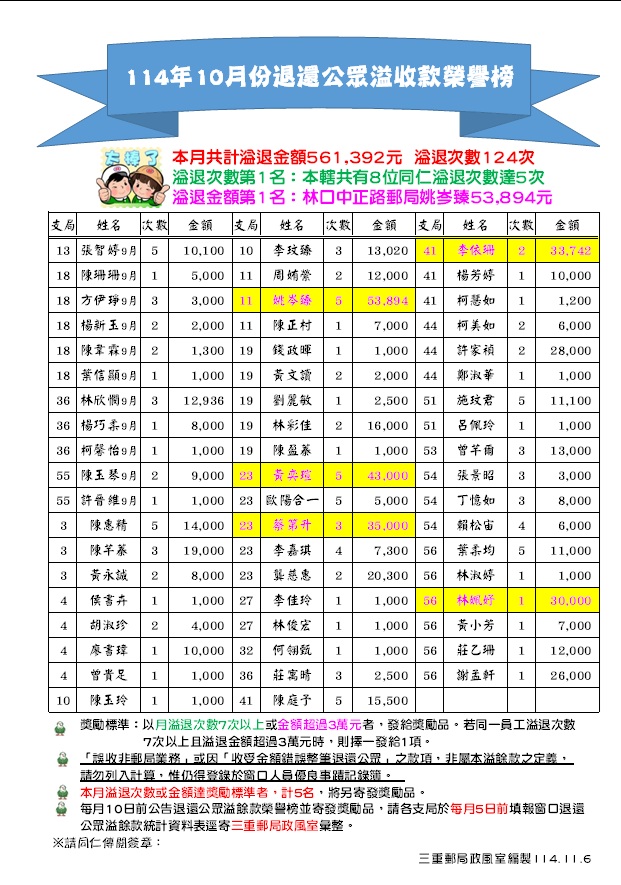 五、每月10日前公告退還公眾溢餘款榮譽榜並寄發獎勵品,請各支局於每月
