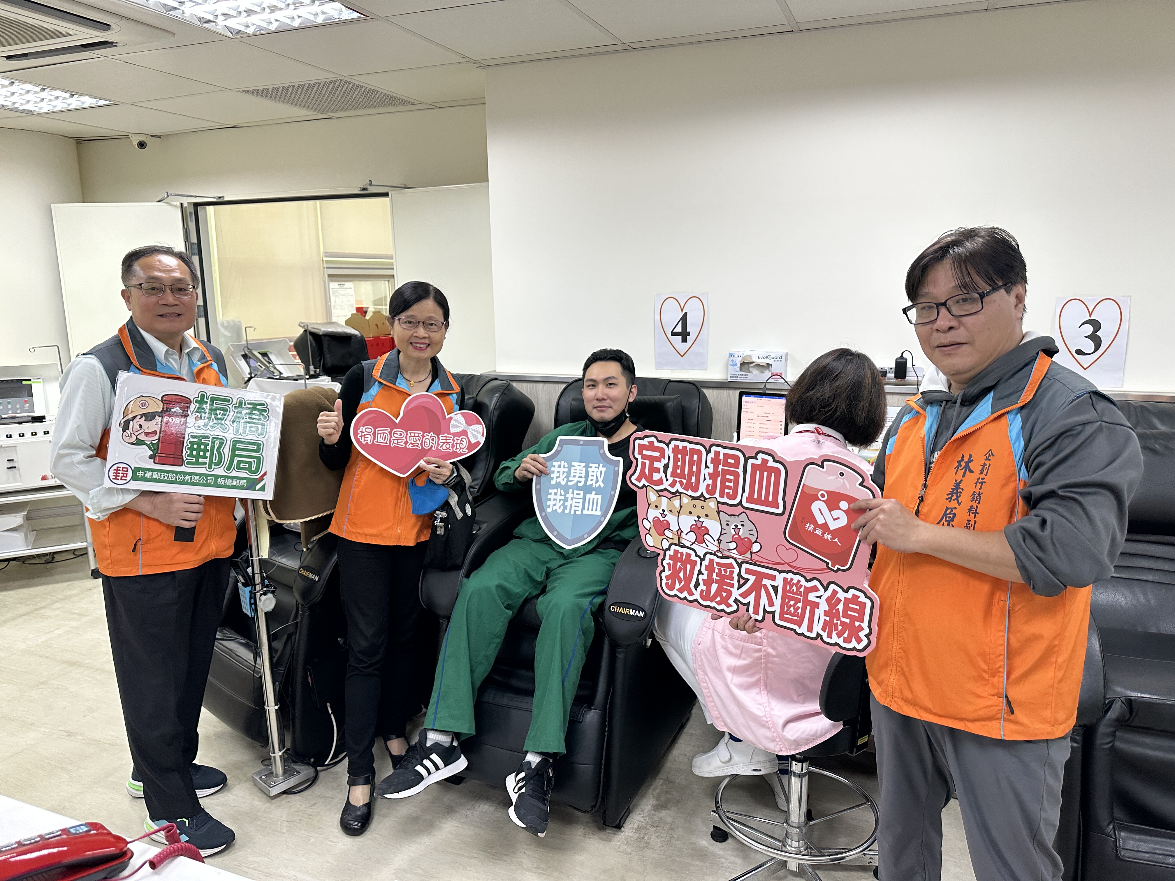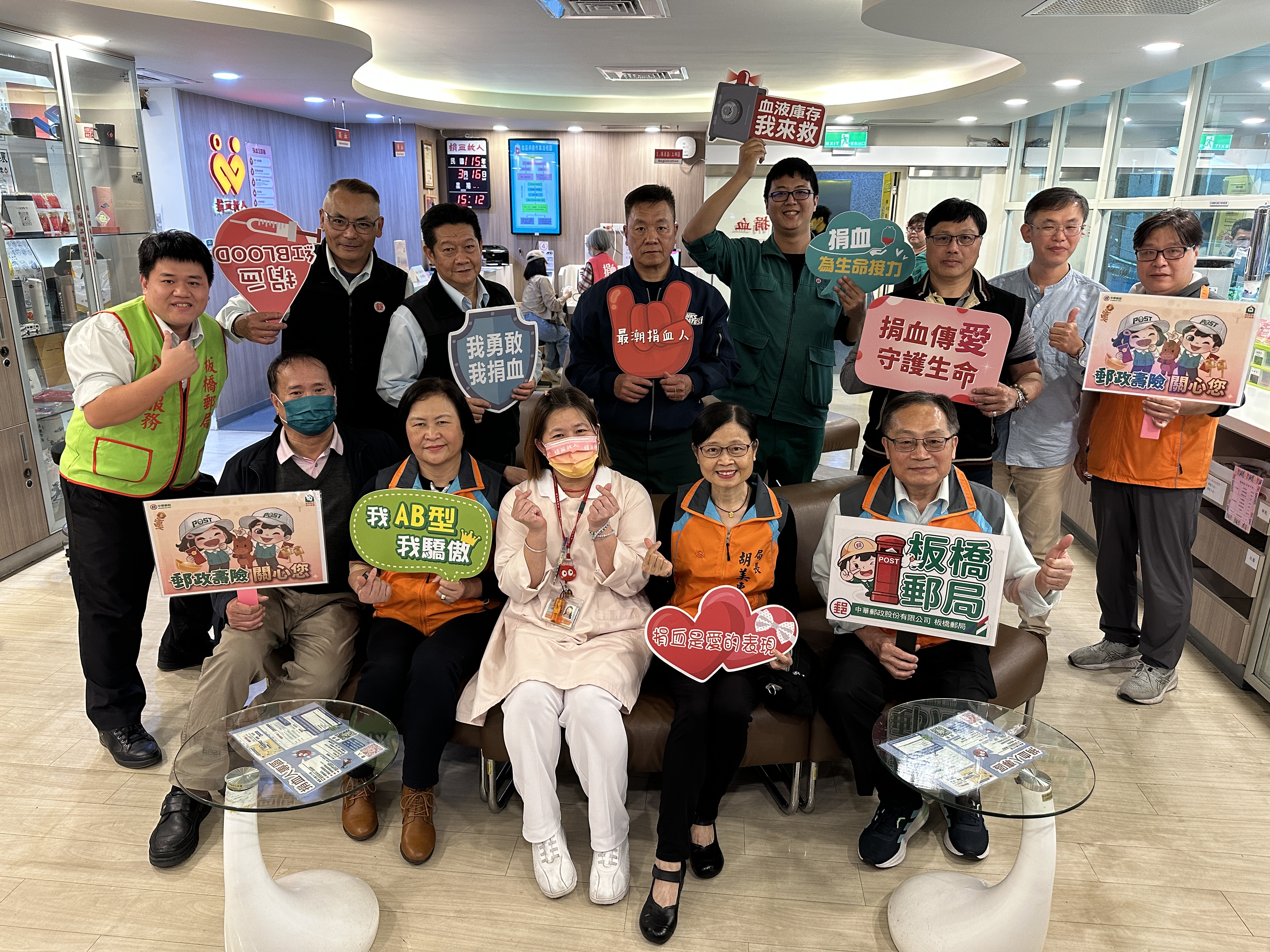 板橋郵局局長胡美惠特於3月16日率領熱血郵務士拜訪板橋捐血站,以實際行動一同響應。胡局長表示,「捐血一袋,救人一命」,期許透過本次活動,讓員工及社會大眾充分體認捐血的重要性,鼓勵更多人一起定期捐血,讓愛心傳遞到全台各地!