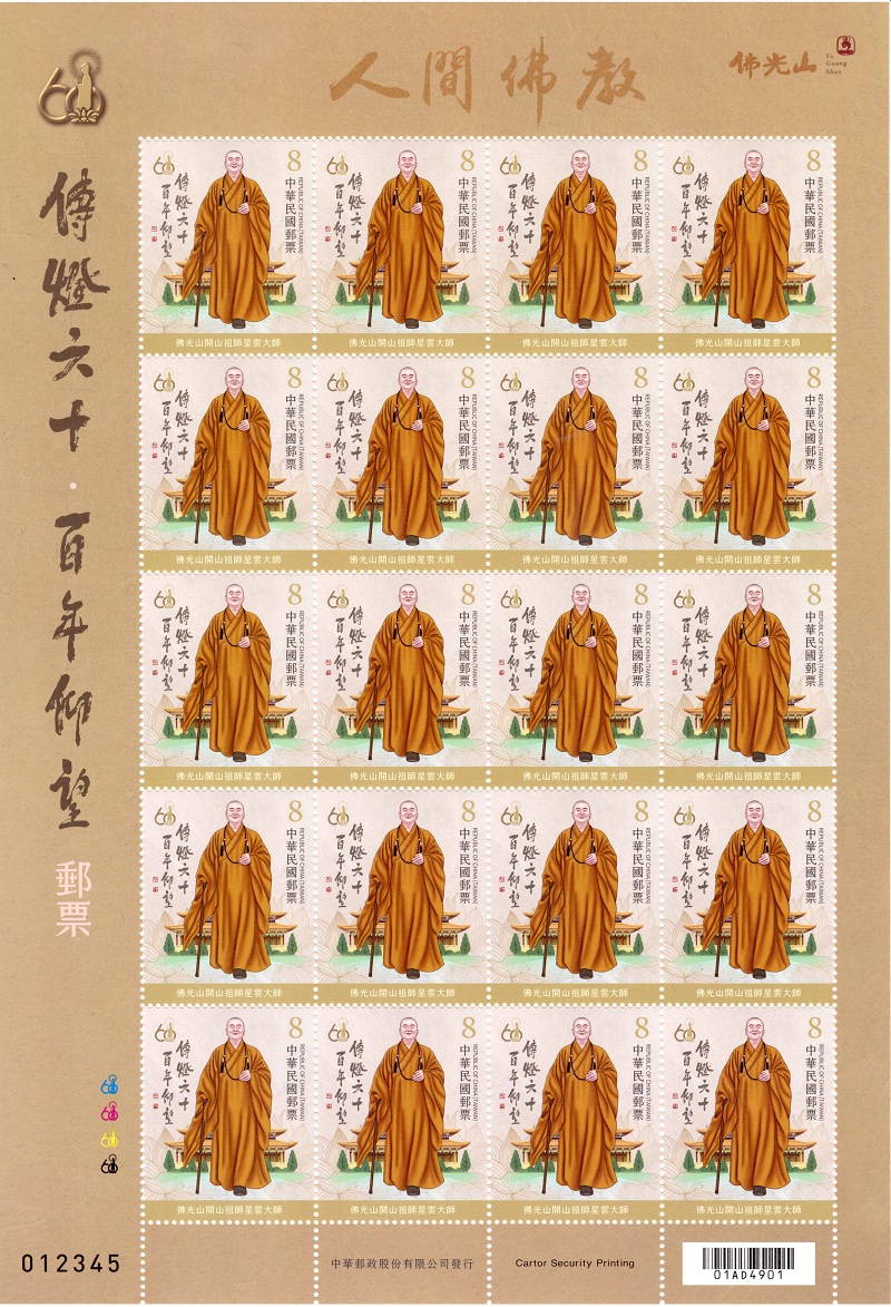 民國115年(西元2026年)適逢佛光山開山六十年暨星雲大師百歲誕辰。為表崇敬與緬懷,本公司特發行郵票1枚及小全張1張。本套郵票彰顯星雲大師一生致力佛教之制度化、現代化、藝文化與國際化;小全張以紙雕及插畫風格展現佛光山佛法僧三寶具足之內涵,呈現人間佛教和諧、智慧的文化底蘊以及弘法的時代性、多元性。圖案簡介如下:一、面值8元郵票:傳達星雲大師悲願宏深,以眾為我,畢生弘揚人間佛教,正如其自述:「心懷度眾慈悲願,身似法海不繫舟;問我一生何所求,平安幸福照五洲」,堪為「人間佛教行者」。二、小全張:1.佛光山佛陀紀念館(面值8元):象徵佛寶,供奉佛牙舍利,發揚佛陀慈悲濟世之精神。2.佛光山藏經樓(面值8元):代表法寶,以教育培養人才,傳承佛陀為人間創造和平安樂之教法。3.佛光山大雄寶殿(面值15元):象徵僧寶,僧眾行持佛陀教法,建設人間淨土之道場。4.「合掌人生」精神(面值15元):星雲大師合十感謝各界發心護持。顧客如有需要,郵票請向全國各地郵局、郵政博物館洽購,或上網至「i集郵」訂購。