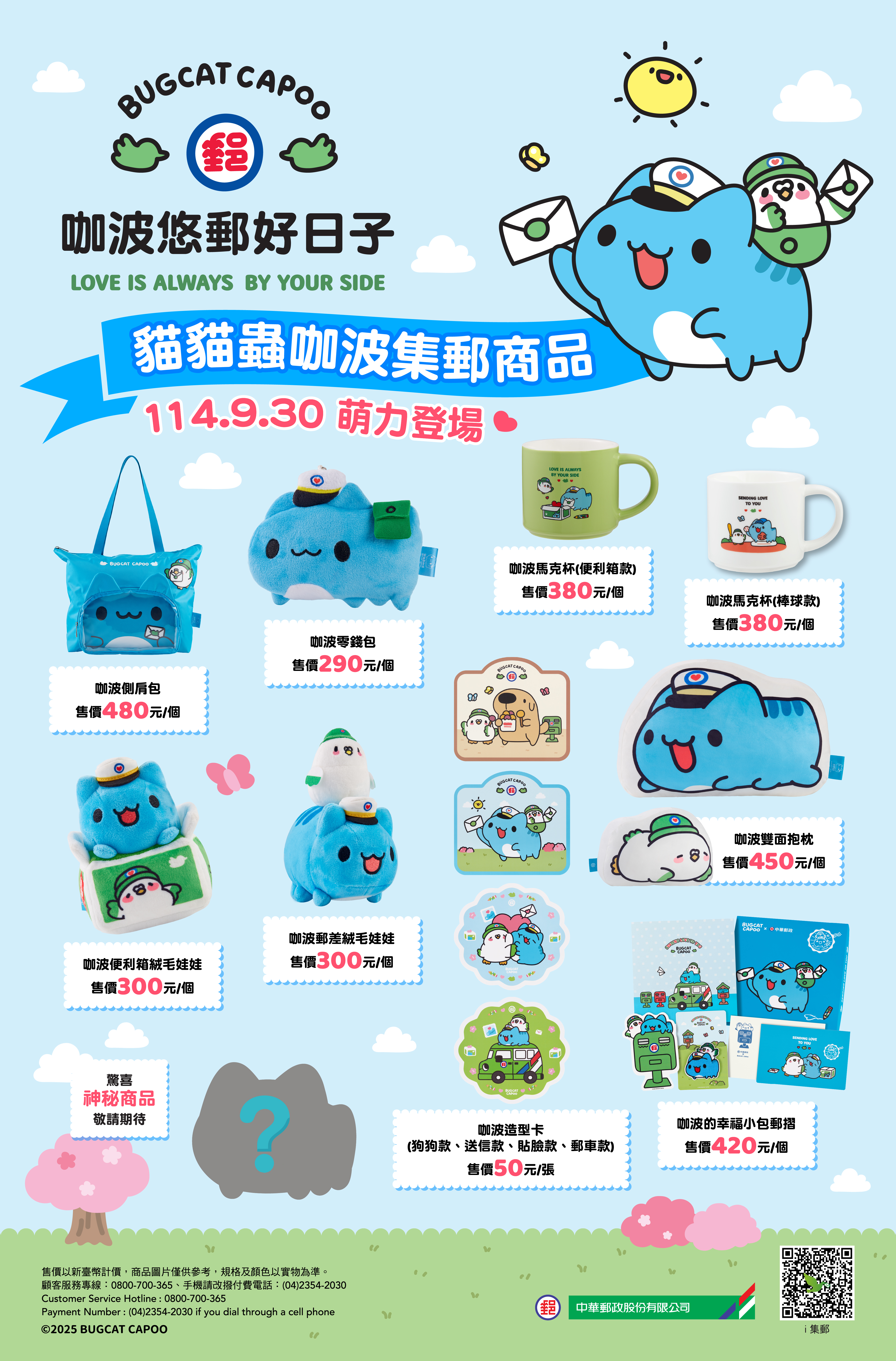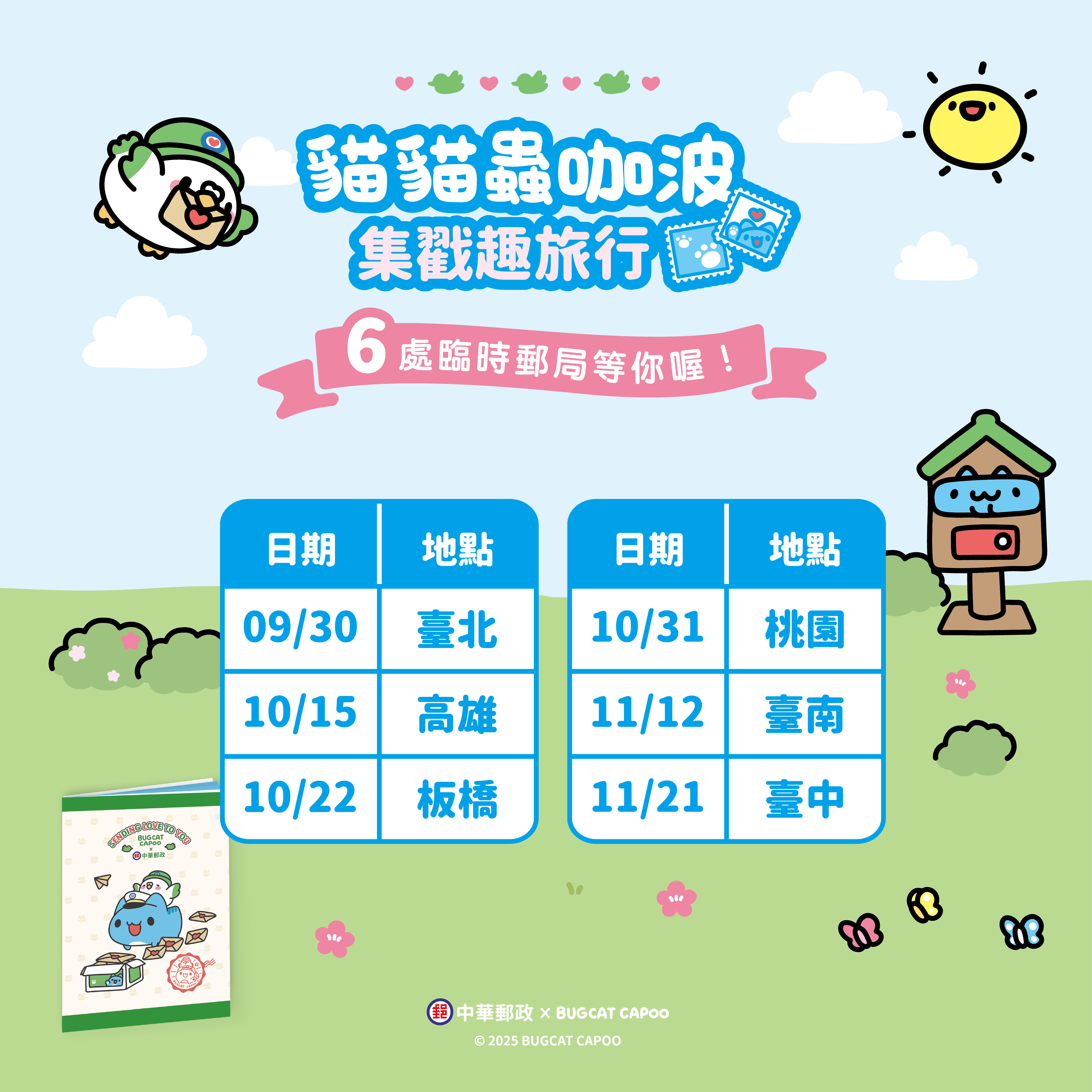 本公司將於9月30日下午2時,在臺北北門郵局挑高大廳(臺北市中正區忠孝西路一段120號)舉辦「貓貓蟲咖波郵票小全張」發行暨商品發表會,並於郵政博物館臺北館、板橋文化路郵局、桃園成功路郵局、郵政博物館臺中館、臺南成功路郵局及郵政博物館高雄館,打造6處不同主題「咖波郵局」,邀請大家一同迎接咖波首次躍上郵票的精彩時刻!