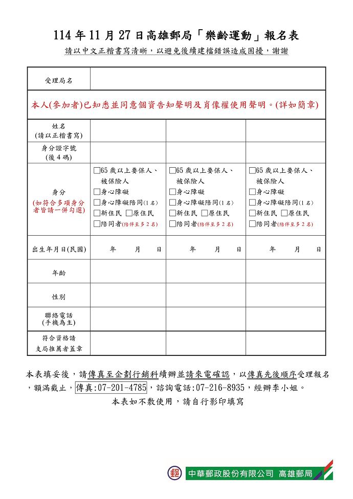 本局訂於114年11月27日(四)舉辦「中華郵政樂齡運動」,自114年11月4日(二)起開始傳真報名,額滿為止。 114/11/04