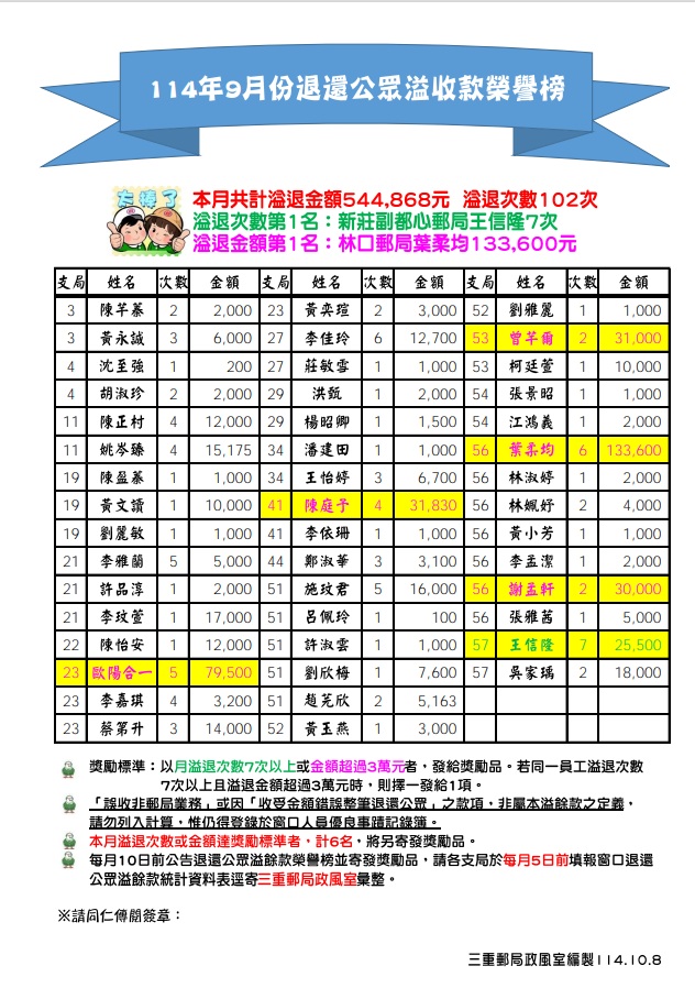 五、每月10日前公告退還公眾溢餘款榮譽榜並寄發獎勵品,請各支局於每月