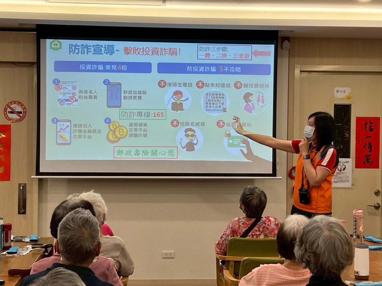 隨著詐騙手法日新月異,長者往往成為詐騙集團眼中的目標,本次講座板橋郵局特別邀請該局特聘講師及新北市政府警察局海山分局員警,結合真實案例,深入淺出地講解各類常見詐騙手法,如投資詐騙、假冒親友詐騙及網路購物分期,提醒民眾若遇可疑情形,切莫驚慌並熟記防詐三步驟「一聽、二掛、三查證」,並撥打165反詐騙專線,一起識詐並阻詐。
