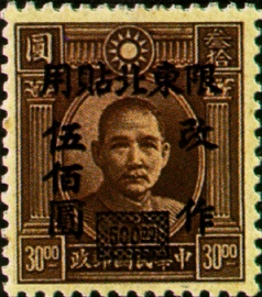 由上海供應處交商以楷字加蓋黑色「限新省貼用」5字﹐橫行蓋於國徽與先烈像之間。
