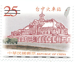 (2)臺北火車站:為臺灣鐵道最早發展的地方,1891年興建於大稻埕。郵票圖案呈現之第3代車站係於1901年遷址至城北,為紅磚造、仿文藝復興風格之建築。1940年完成之鋼骨鋼筋混凝土構造之第4代車站,一直維持到民國75年鐵路地下化後拆除。當時的建築融合了古典裝飾和現代構造,被歸類為「過渡式樣」或「折衷主義期」建築。